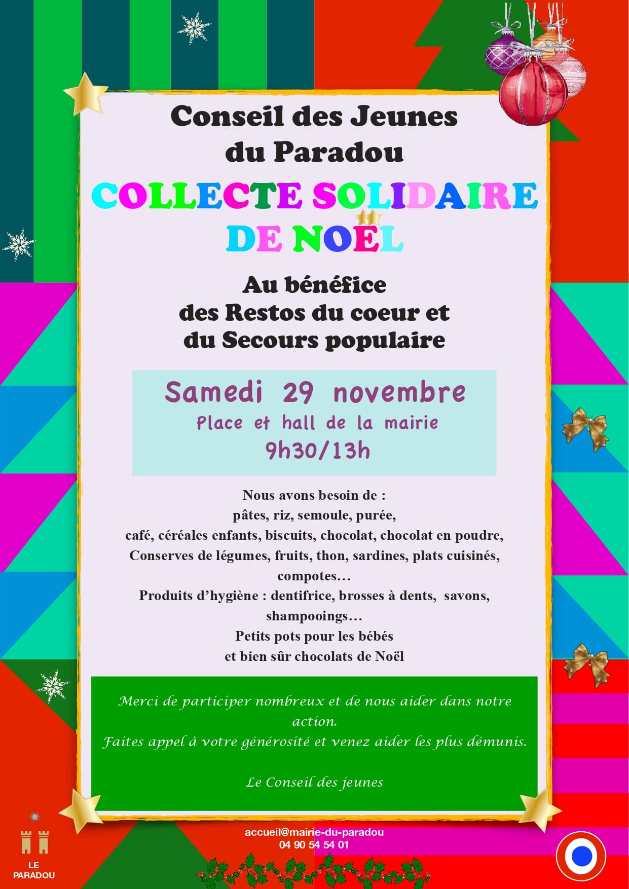 - De 9h30 à 13h, le Conseil des jeunes collecte pour Les Restos du Coeur et le Secours populaire Place et hall de la mairie